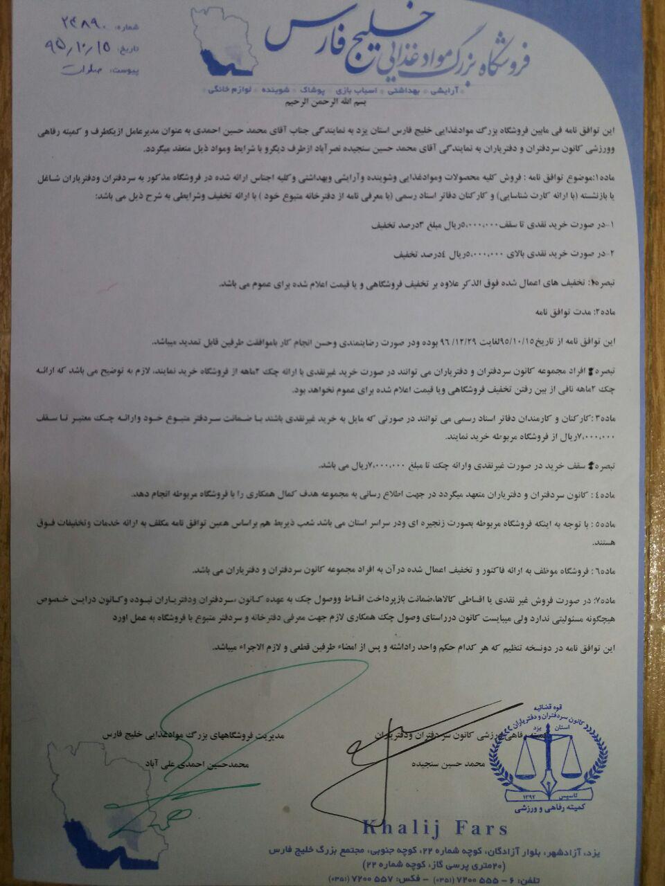 پیرو توافق صورت گرفته بشماره ۲۴۸۹مورخ ۱۳۹۵/۱۰/۱۵فی مابین کمیته رفاهی و ورزشی کانون سردفتران و دفتریاران و فروشگاهای زنجیره ای خلیج فارس ،