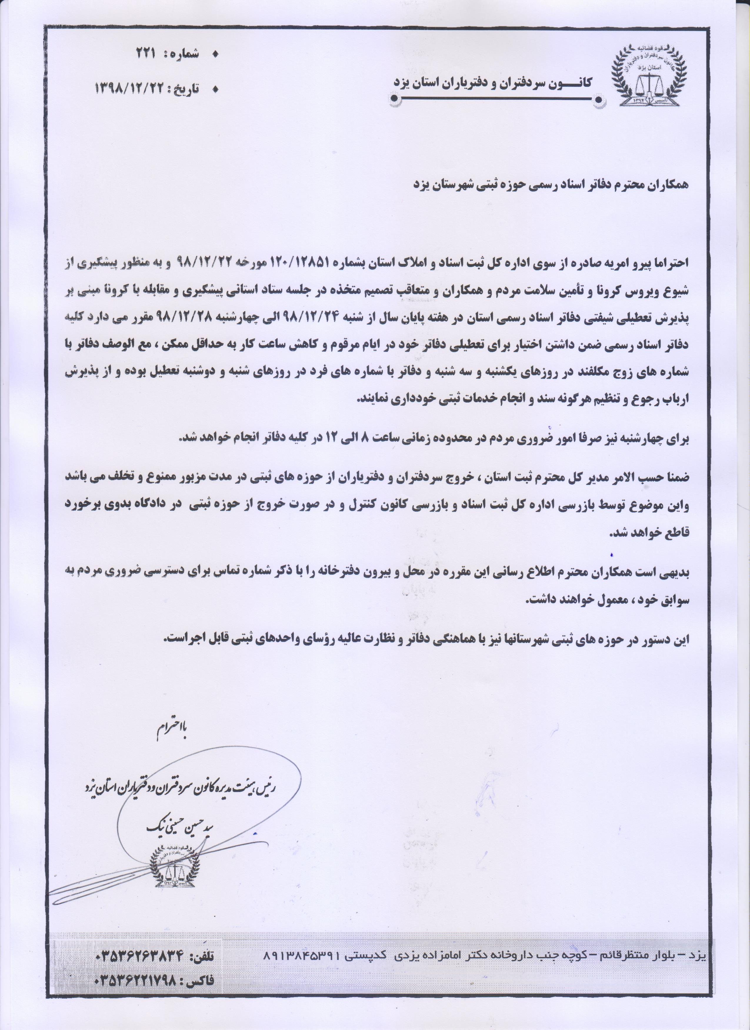 کانون سردفتران و دفتریاران استان یزد بعنوان چهارمین کانون استانی کشور بعد از قریب به ده سال پیگیری های مستمر جامعه سردفتران یزد و همکاران در سطح استان و مساعدت هیئت مدیره کانون تهران با ابلاغ قوه قضائیه و تشکیل هیئت نظارت و با بیش از ده جلسه در تاریخ 17 آذرماه 91 با برگزاری انتخاباتی ارام و و در فضائی سالم و حضور فعال همراه با شعور و احساس مسئولیت کلیه سردفتران و دفتریاران استان اعضای هیئت مدیره انتخاب و در شب میلاد بابرکت امام عصر (عج) در دوم تیرماه 1392 با حضور معاونت قوه قضائیه و ریاست سازمان و معاونین و هیئت همراه و اعضای هیئت مدیره کانون و مقامات قضائی و اداری استان یزد افتتاح و ابلاغ منتخبین توسط آقای دکتر تویسرکانی و مقامات استانی به آنان اعطا و به میمنت و مبارکی این روز بزرگ و هفته قوه قضائیه کانون یزد شروع بکار نمود