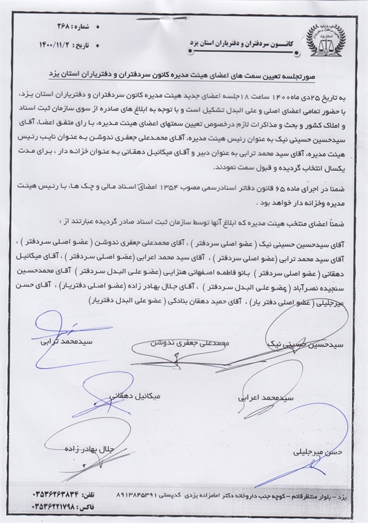 صورت جلسه تعیین سمت های اعضای هیئت مدیره کانون سردفتران ودفتریاران استان یزد