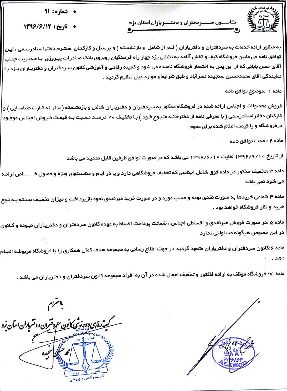 توافق نامه کانون سردفتران ودفتریاران یزد با فروشگاه کیف و کفش آلامد