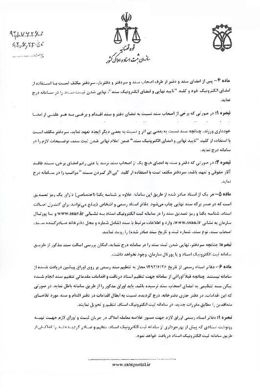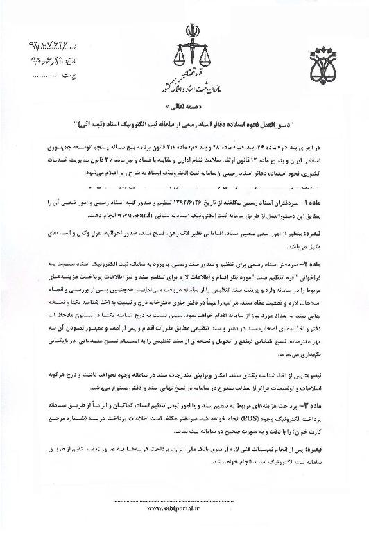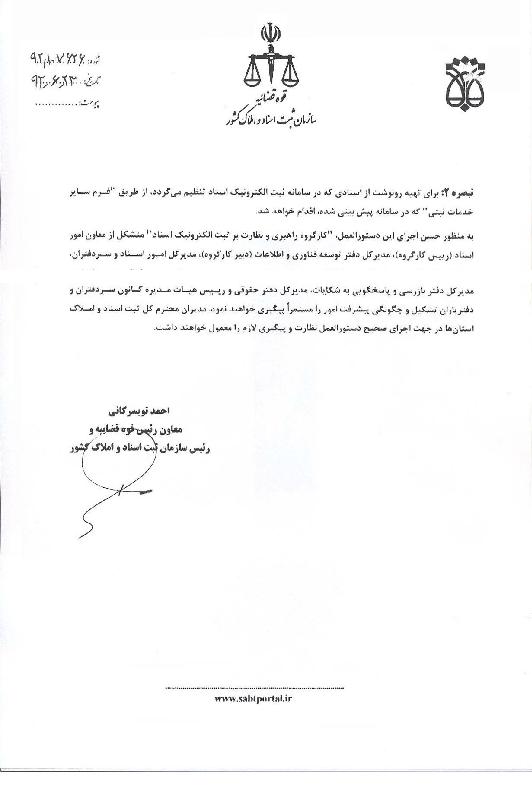 معاون محترم امور اسناد سازمان، مدیران محترم کل ثبت اسناد و املاک استانها ، کانون سردفتران و دفتریاران نظارت لازم جهت حسن اجرای بخشنامه را معمول خواهند داشت.